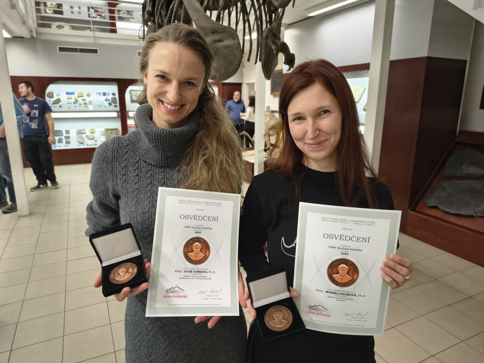 Researchers of the Institute of Geology Lucie Vaňková and Monika Uhlířová became laureates of the Zlatko Kvaček Prize of the Institute of Geology and Palaeontology, Faculty of Science, Charles University, in December. This annual award recognises the best scientific publications in the fields of palaeobiology, palaeoclimatology, palaeoceanology and geobiology. Lucie Vaňková received the prize in the academic staff category and Monika Uhlířová in the PhD student category. The awarded studies provide new insights into environmental change across the Jurassic–Cretaceous transition and into early Silurian land plants. We wish to congratulate both laureates. Awarded publications: Vaňková, L. et al.: Macrofauna and stable isotope record of the Jurassic‒Cretaceous transition at the Dedina section (Golubac, eastern Serbia); Uhlířová, M. et al.: An early land plant with coiled fertile tips from the upper Silurian (Přídolí) of the Barrandian area (Czech Republic).