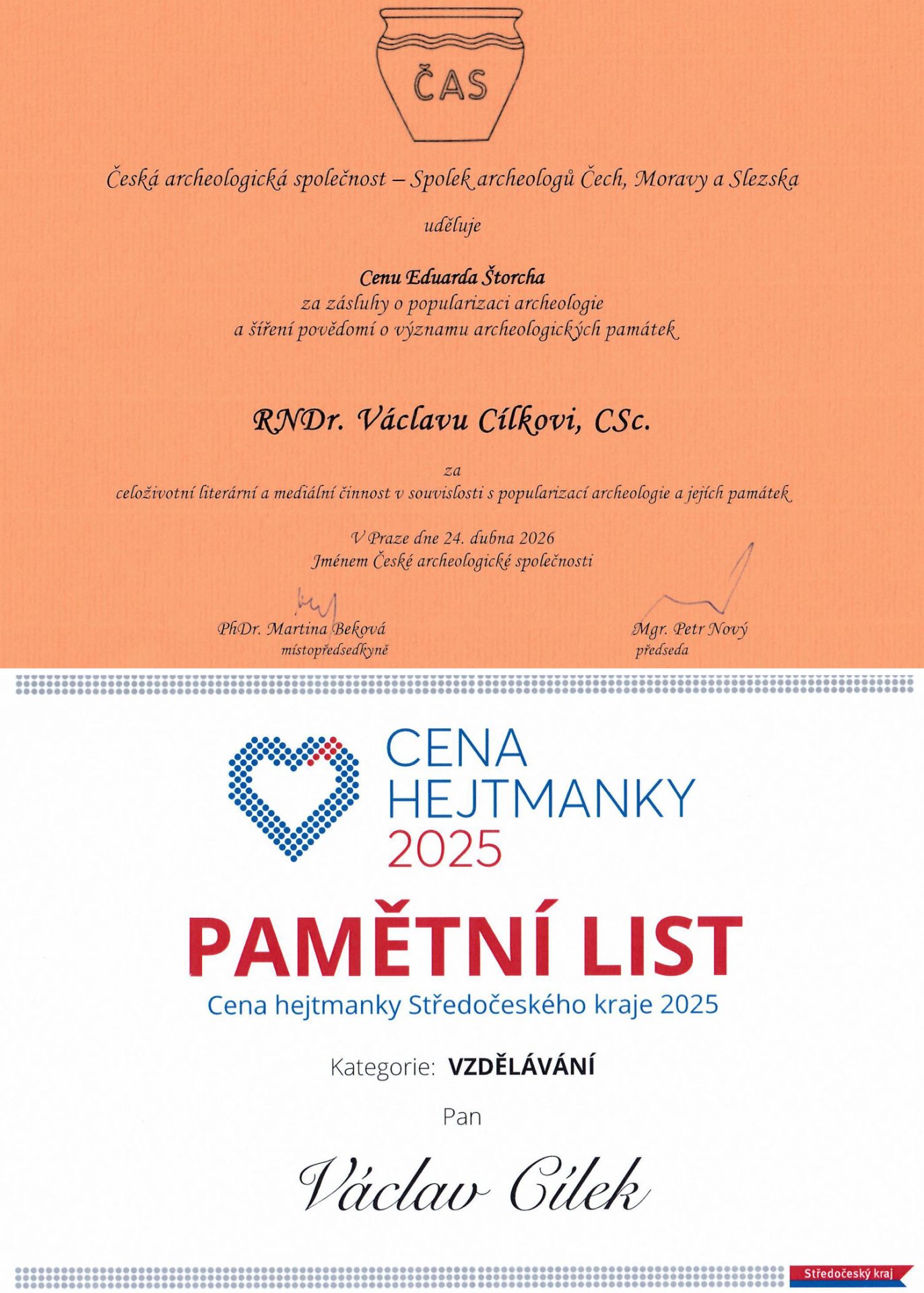 In late March, Václav Cílek was granted the Eduard Štorch Award by the Czech Archaeological Society for his promotion activities in archaeology. This award follows multiple collaboration with archaeologists, resulting in the publication of a trilogy on historic trails, books on Říp Hill, Blaník Hill, the Vltava River and on other locations. Václav Cílek also received the Award of the Governor of the Central Bohemian Region in the “Education” category for a series of 12 books on this region. Two of the volumes were edited by the former staff member of the Institute of Geology Karel Žák (Křivoklátsko and Džbán). Besides, a special award of the Governor was granted to ing. Josef Velfl, who founded the Open-air Mining Museum near Příbram and who collaborated with Václav Cílek on the book “Uranová Příbram” (Dokořán Publishing House, 2022, re-edition 2026). Congratulations.